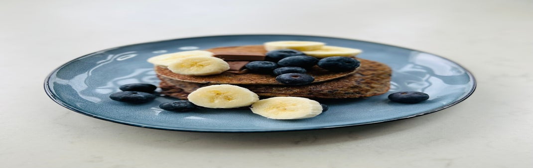 Havermout pancakes met banaan, chocolade en blauwe bessen