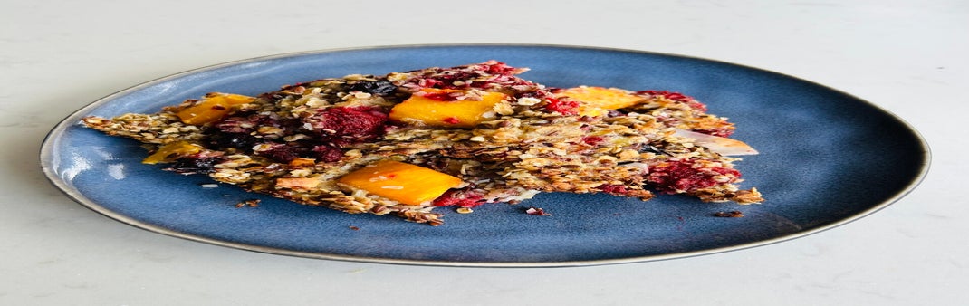 Kwark met blauwe bessen, kokos, gedroogde abrikoos en rozijnen