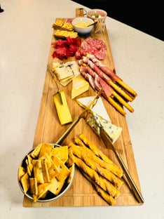 Halveer de kazen en vleeswaren en leg alles op de borrelplank. Bewaar de rest voor later om de plank aan te vullen indien deze leeg raakt.