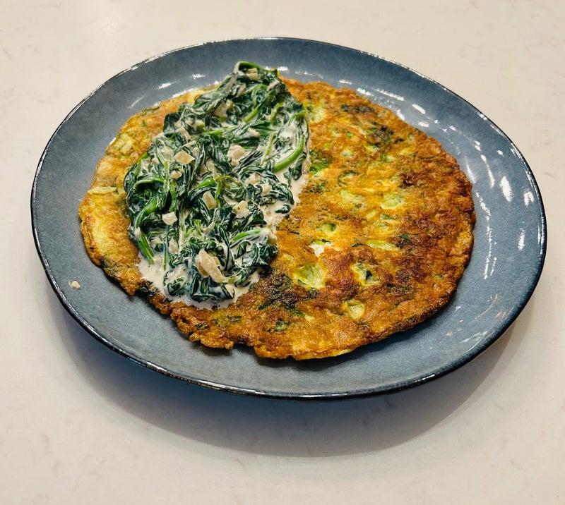 - Leg de gebakken eierwrap op een bord en schep het spinazie-roomkaasmengsel op 1 helft van de eierwrap. Vouw de eierwrap dubbel.