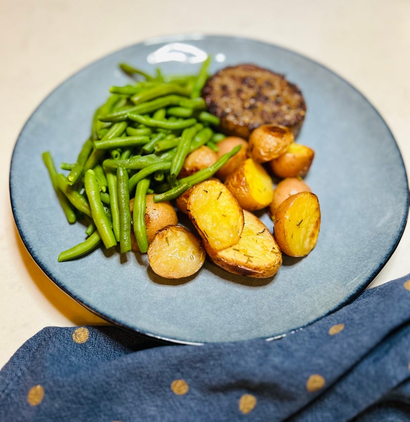 - Schep de kipschnitzel, krieltjes en groenten op een bord.